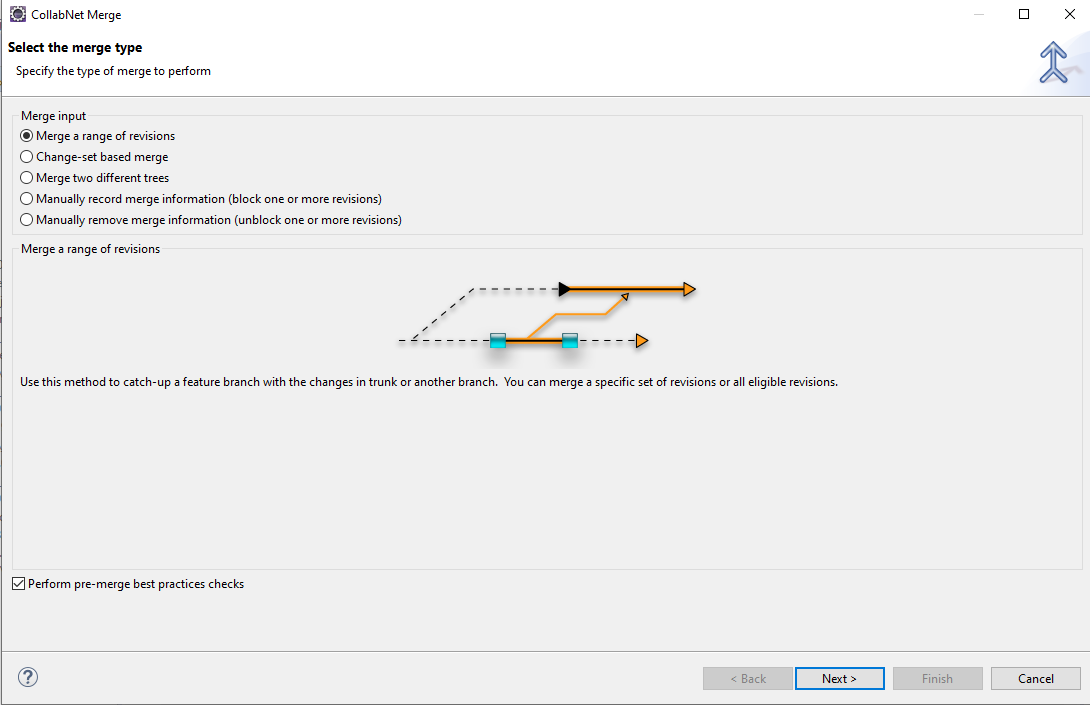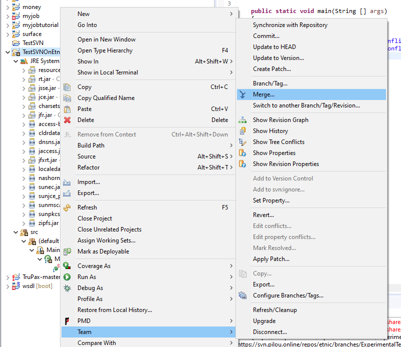 Cliquez avec le bouton droit de la souris sur la branche ou le coffre, sélectionnez Equipe> Fusionner. Choisissez Fusionner une plage de révisions si la fusion va du tronc à la branche. Sinon, sélectionnez Réintégrer une branche.